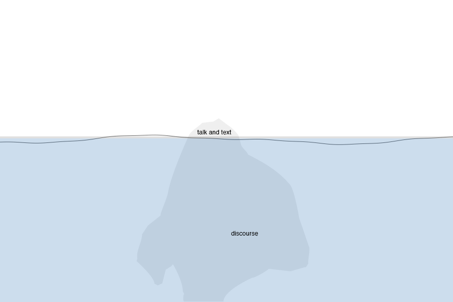 I’m tinkering with metaphors to explain/teach discourse analysis to an undergrad human-centered design class. One way to explain it might be in terms of an iceberg. Discourse is sort of like an iceberg in the sense that there is a lot going on beneath the surface that we don’t see when we encounter talk and text in the world. Discourse analysis aims to expose this unseen stuff, explain how it influences talk and text, and, ultimately, change this influence. Here’s a sketch: